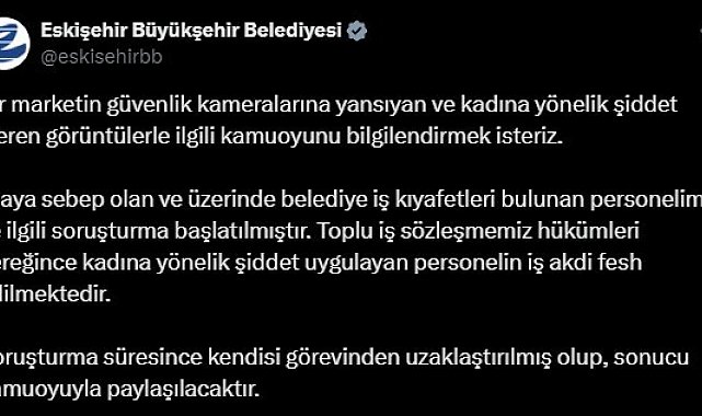Eskişehir Büyükşehir Belediyesi tarafından yapılan açıklamada, "Bir marketin güvenlik kameralarına yansıyan ve kadına yönelik şiddet içeren görüntülerle ilgili kamuoyunu bilgilendirmek isteriz. Olaya sebep olan ve üzerinde belediye iş kıyafetleri bulunan personelimiz ile ilgili soruşturma başlatılmıştır. Toplu iş sözleşmemiz hükümleri gereğince kadına yönelik şiddet uygulayan personelin iş akdi feshedilmektedir. Soruşturma süresince kendisi görevinden uzaklaştırılmış olup, sonucu kamuoyuyla paylaşılacaktır" ifadelerine yer verildi.