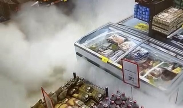 Markette ilginç anlar: Yangın tüpü yere düştü, çalışan panikle kaçtı