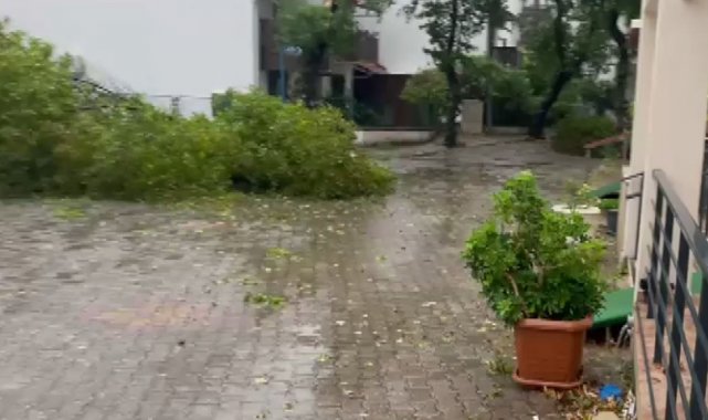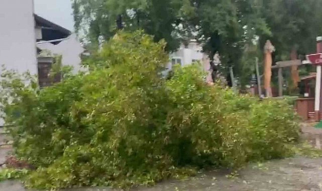 Muğla'nın Marmaris ilçesinde sabah saatlerinden bu yana sağanak yağış etkili olurken, zaman zaman etkisini artıran fırtına nedeniyle de bazı ağaçlar kırılarak yollara devrildi.