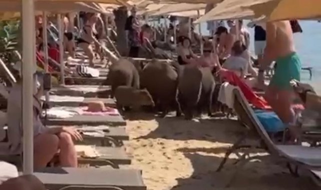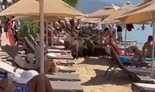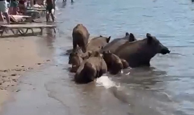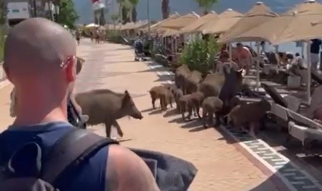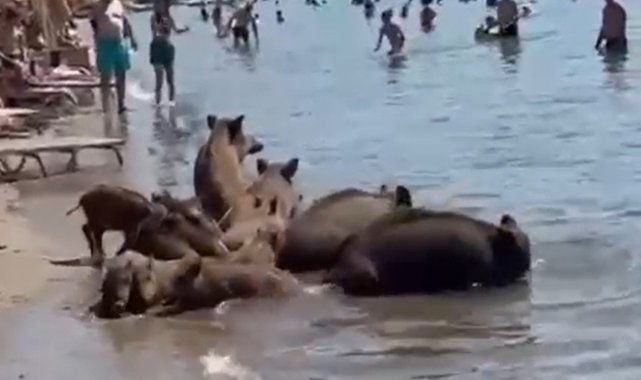 Marmaris şehir merkezinde toplanmayan çöpleri karıştıran yaban domuzları sıradan hale gelirken, domuzların bu seferki durağı sahiller oldu. Siteler Mahallesi'nde yaban domuzları tatilcilerin şaşkın bakışları arasında sahilde dolaştı. Yavrularıyla birlikte sahil boyunca yiyecek arayan domuzlar, daha sonra denize girdi. Plajda gezen domuzlar, denizde bir süre vakit geçirdikten sonra sahilden ayrıldı. Turistler ise yaşanan ilginç anları cep telefonlarıyla kaydetmeyi ihmal etmedi.