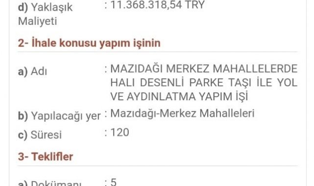 Mazıdağı Belediyesi, Çiğdem Caddesi'ne döşeli parke taşlarını kaldırarak, yerine halı desenli yol yaptı. İhale usulü halı desenli yolu yapan belediye, ihaleyi 11 milyon 368 TL karşılığında Batman'da faaliyet gösteren yüklenici firmaya verdi. Dudak uçuklatan fiyatı duyan vatandaşlar, belediyeye tepki gösterdi.