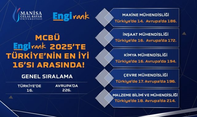 EngiRank 2025 verileri, Türkiye'nin mühendislik eğitimi alanında Avrupa'nın en başarılı ülkeleri arasında dikkat çeken bir yükseliş gösterdiğini ortaya koydu. Avrupa Komisyonu tarafından da önemsenen EngiRank, Avrupa Yükseköğretim alanında yer alan yükseköğretim kurumlarını çok yönlü kriterlerle değerlendirdi. Manisa Celal Bayar Üniversitesi mühendislik programlarıyla Türk üniversiteleri arasından 16., Avrupa'da ise 226. sırada listeye girmeyi başardı. Alan bazlı sıralama sonuçlarına göre Manisa Celal Bayar Üniversitesi, Makine Mühendisliği: Türkiye'de 14. Avrupa'da 186., İnşaat Mühendisliği: Türkiye'de 16. Avrupa'da 172., Kimya Mühendisliği: Türkiye'de 16. Avrupa'da 194., Çevre Mühendisliği: Türkiye'de 17. Avrupa'da 196., Malzeme Bilimi ve Mühendisliği: Türkiye'de 18. Avrupa'da 214. sırada yer aldı. EngiRank; klasik sıralama sistemlerinden farklı olarak Avrupa'ya özgü metodolojisiyle akademik yayın ve atıf performansı, Avrupa Araştırma Konseyi projelerine katılım, Erasmus+ ve Horizon Europe faaliyetleri, mühendislik akreditasyonları, patent üretkenliği, sanayi iş birlikleri ile Birleşmiş Milletler Sürdürülebilir Kalkınma Hedeflerine katkı gibi stratejik göstergeleri temel almaktadır. Elsevier Scopus ve kurumsal raporlama gibi güvenilir veri kaynaklarına dayanan değerlendirme, üniversitelerin araştırma ve eğitim performansını bütüncül bir perspektifle ölçmektedir.