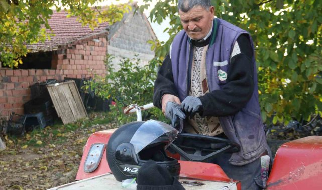 Eskişehir'de yaşayan 67 yaşındaki çiftçi yeni yönetmeliğe uygun şekilde kask, koruyucu gözlük ve eldiveni takıp, traktörü ile tarlasını sürdü. Çiftçi Mehmet Son, "Bütün bu işleri kafamızda kask varken yapacağız. Herhangi bir zarara karşı kask bizi koruyacak" dedi.