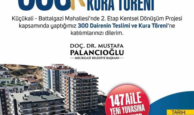 Kentsel dönüşümde örnek ve referans çalışmalarına devam eden Melikgazi Belediyesi; Küçükali-Battalgazi Mahallesi'nde yapımını tamamladığı 7 blok, 300 dairenin teslimini ve kura törenini gerçekleştirecek.