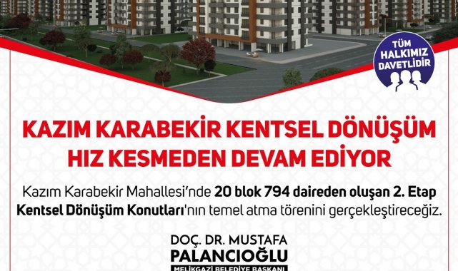 Melikgazi Belediye Başkanı Doç. Dr. Mustafa Palancıoğlu; 21 Ocak Salı günü saat 13.30'da Altınoluk Mahallesinde 120 konuttan oluşan Yatay Mimari Projesi'nin temel atma töreninin ardından 22 Ocak Çarşamba günü saat 13.00'te Kazım Karabekir 2. etap kentsel dönüşüm konutlarının da temel atma törenini gerçekleştireceklerini söyledi.