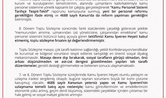 8. Dönem Toplu Sözleşme sürecine de değinilen açıklamada, "8. Dönem Toplu Sözleşme sürecinde; farklı statülerdeki çarpıklığı giderecek şekilde 'memurundan amirine, uzmanından üst yöneticisine, çalışanından emeklisine' kamu personel sistemini bütüncül bakış açısıyla gören teklifimizi Kamu İşveren Heyeti kabul etmemiş, toplu sözleşme fırsatını iyi değerlendirmemiştir. Toplu Sözleşme masası; çok taraflı katılımın sağlandığı, yetkili Konfederasyon, sendikalar ile kurumsal ve bölgesel sorunların tespit edilerek tartışıldığı en önemli sosyal diyalog mekanizmasıdır. Masayı devre dışı bırakarak, sosyal tarafların görüşü olmadan, önü arkası düşünülmeden ve ast-üst dengesi gözetilmeden yapılan tek taraflı düzenlemeler; gerekli desteği görmemekte ve beklenen sonuca ulaşmamaktadır" ifadeleri kullanıldı.