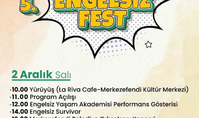 Merkezefendi Belediyesince düzenlenen 'Engelsiz Fest'in beşincisi bu yıl da gerçekleştirilecek. Etkinlik, 2 Aralık Salı günü Merkezefendi Kültür Merkezi'nde yapılacak. Festival, 2 Aralık Salı günü saat 10.00'da Merkezefendi Kültür Merkezi'nde yürüyüş (Yenişehir Yürüyüş Yolu'nda) ile başlayacak. Yürüyüşün ardından program açılışı 11.00'de gerçekleştirilecek. Saat 12.00'de Engelsiz Yaşam Akademisi'nde eğitim gören özel bireyler Performans Gösterisi düzenleyecek. Saat 14.00'te ikinci kez düzenlenecek olan 'Engelsiz Survivor ile heyecanlı bir yarış başlayacak. Saat 16.00'da ise Merkezefendi Belediye Orkestrası Konseri ile etkinlik sona erecek.