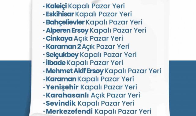 Kaleiçi Kapalı Pazar Yeri, Eskihisar Kapalı Pazar Yeri, Bahçelievler Kapalı Pazar Yeri, Alperen Ersoy Kapalı Pazar Yeri, Cinkaya Açık Pazar Yeri, Karaman 2 Açık Pazar Yeri, Selçukbey Kapalı Pazar Yeri, İlbade Kapalı Pazar Yeri, Mehmet Akif Ersoy Kapalı Pazar Yeri, Karaman Kapalı Pazar Yeri, Yenişehir Kapalı Pazar Yeri, Karahasanlı Açık Pazar Yeri, Sevindik Kapalı Pazar Yeri, Merkezefendi Kapalı Pazar Yeri.