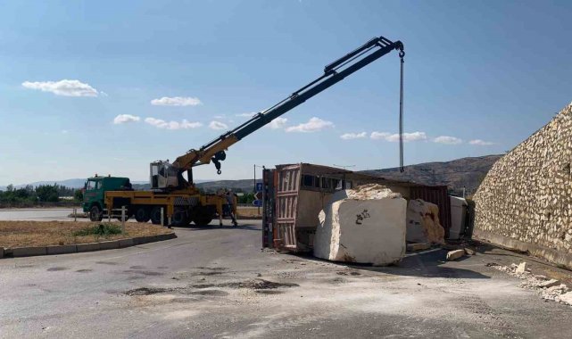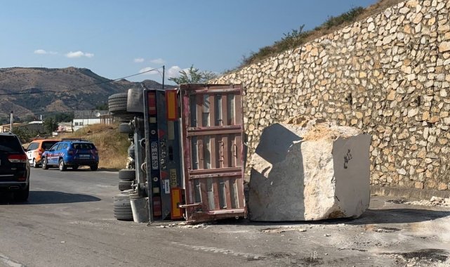Mermer blok yüklü tır yola devrildi: 1 yaralı