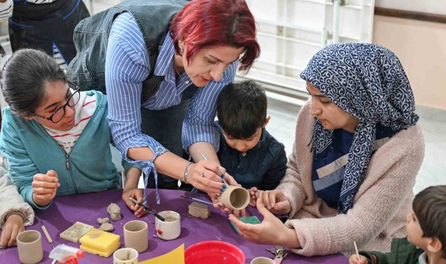 Kadın ve Aile Hizmetleri Dairesi Başkanlığı bünyesinde faaliyetlerini sürdüren Mevlana Kadın ve Çocuk Atölyesinde, anne ve çocuk etkinliği düzenlendi. Etkinlikte, atölyeden faydalanan çocuklar anneleriyle birlikte seramik atölyesine katıldı. Anne ve çocuk ilişkisini güçlendirmeyi ve aile içi iletişimi artırmayı amaçlayan etkinlikte, çocuklar anneleriyle birlikte seramik hamuru yoğurdu. Hayal gücünden ilham alarak seramik hamuruna şekil veren anne ve çocuklar, ardından yaptıkları seramik figürlerini rengarenk boyadılar.