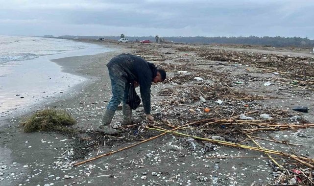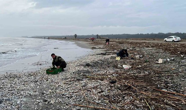 Mersin'de sel ve fırtına sonrası oluşan güçlü dalgalarla birlikte Adanalıoğlu sahilinde binlerce kargı midyesi kıyıya vururken, balıkçılar midyeleri yem yapmak için topladı.