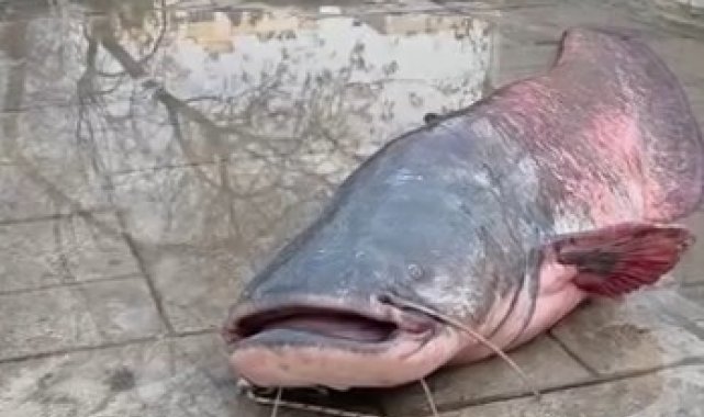 Görüntülerde, balıkçının yakaladığı dev yayın balığını, nehir kenarında güvenlik amacıyla bulunan demir bariyerin arkasından kontrol altına almaya çalıştığı, bir başka vatandaşın ise bariyerin ön tarafından balığa bağlanan ipi çekerek kıyıya çıkarmaya yardım ettiği anlar yer aldı.