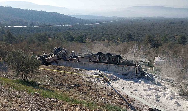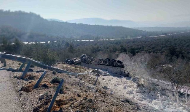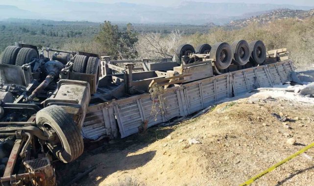 Mersin'in Mut ilçesinde alçı yüklü tırın şarampole devrilmesi sonucu meydana gelen kazada 2 kişi hayatını kaybetti.
