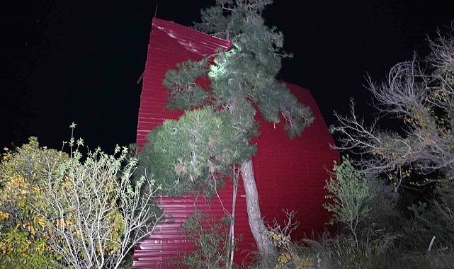 Mersin'de şiddetli rüzgar yerinden söktüğü bir evin çatısını uçurup çam ağacının üzerine savurdu, asırlık bir meşe ağacını da devirdi.