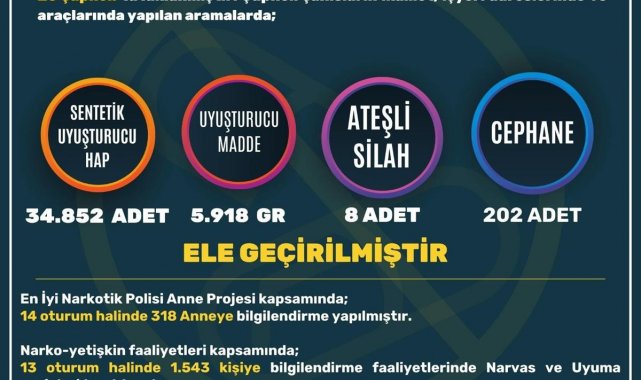 Uyuşturucu ile mücadele çalışmalarında ise 183 şüpheli yakalanırken, bunlardan 26'sı tutuklandı. Şüpheli şahısların ikamet ve iş yerleri ile araçlarında yapılan aramalarda, 34 bin 852 adet uyuşturucu hap, 5 kilo 918 gram uyuşturucu madde ile 7 tabanca, 202 tabanca fişeği ve 1 tüfek ele geçirildi. En İyi Narkotik Polisi Anne Projesi kapsamında ise 318 anneye bilgilendirme yapılırken, narko-yetişkin faaliyetleri kapsamında da bin 543 kişiye Narvas ve Uyuma projeleri tanıtıldı.