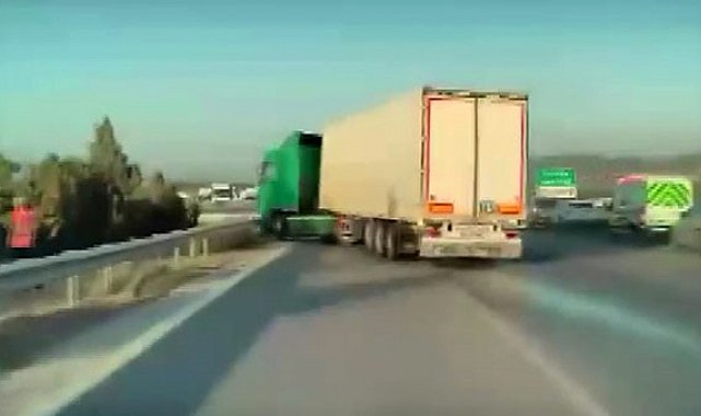 Öte yandan kaza anı kısmen bir aracın kamerasına yansıdı. Görüntülerde peş peşe giden tırlar ile bir tırın kaza anı yansıdı.