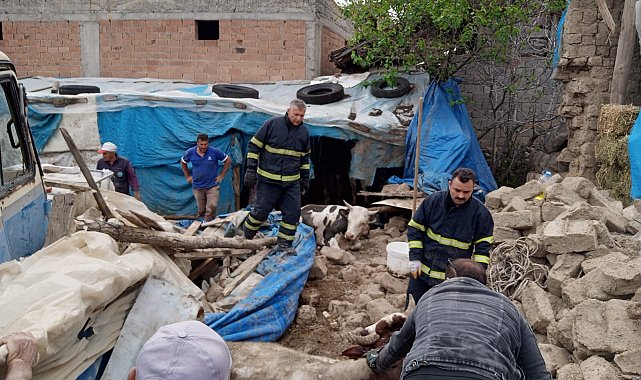 Amasya'nın Merzifon ilçesinde kerpiçten yapılan ahırın tavanı çöktü. Ahırın içinde göçük altında kalan 2 büyükbaş hayvanı itfaiyeciler kurtardı.