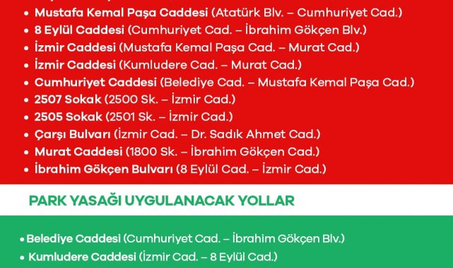 Belediye Caddesi üzeri (Cumhuriyet Caddesi ile İbrahim Gökçen Bulvarı arası), Kumludere Caddesi üzeri (İzmir Caddesi ile 8 Eylül Caddesi arası), 8 Eylül Caddesi üzeri (İbrahim Gökçen Bulvarı ile Kumlu Dere Caddesi arası), İbrahim Gökçen Bulvarı üzeri (Belediye Caddesi ile 8 Eylül Caddesi arası). Vatandaşların mağduriyet yaşamamaları için alternatif güzergahları kullanmaları ve belirtilen tarihlerde trafik yönlendirmelerine uymaları önemle rica edildi.