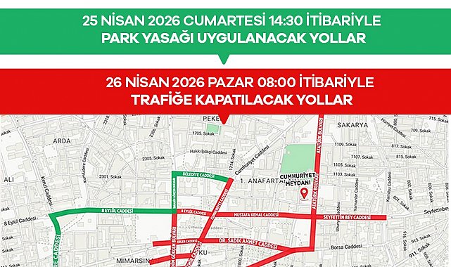 Cumhuriyet Meydanı'na çıkan yollar ile birlikte, Atatürk Bulvarı üzeri (Cumhuriyet Caddesi ile Mustafa Kemal Paşa Caddesi arası), Sultan Camii önüne çıkan yollar, Valilik önüne çıkan yollar, Seyfettin Bey Caddesi üzeri (Kamilsu Caddesi ile Atatürk Bulvarı arası), Mustafa Kemal Paşa Caddesi üzeri (Atatürk Bulvarı ile Cumhuriyet Caddesi arası), 8 Eylül Caddesi üzeri (Cumhuriyet Caddesi ile İbrahim Gökçen Bulvarı arası), İzmir Caddesi üzeri (Mustafa Kemal Paşa Caddesi ile Murat Caddesi arası), 2507 Sokak üzeri (2500 Sokak ile İzmir Caddesi arası), 2505 Sokak üzeri (2501 Sokak ile İzmir Caddesi arası), Çarşı Bulvarı üzeri (İzmir Caddesi ile Dr. Sadık Ahmet Caddesi arası),Murat Caddesi üzeri (1800 Sokak ile İbrahim Gökçen Bulvarı arası), İbrahim Gökçen Bulvarı üzeri (8 Eylül Caddesi ile İzmir Caddesi arası) olan yollar trafiğe kapatılacak.