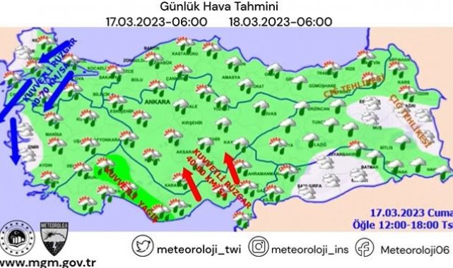 Öte yandan kuvvetli yağış, kuvvetli rüzgar ve çığ tehlikesine karşı dikkati çekilen açıklamada, yağışların; Antalya, Isparta, Mersin, Adana, Kahramanmaraş, Gaziantep, Kilis, Adıyaman, Şanlıurfa ve Mardin çevrelerinde yer yer kuvvetli olması beklenmesi nedeniyle yaşanabilecek ani sel, su baskını, yıldırım, yerel dolu yağışı, ulaşımda aksamalar ve fırtınaya karşı uyarılarda bulunuldu.