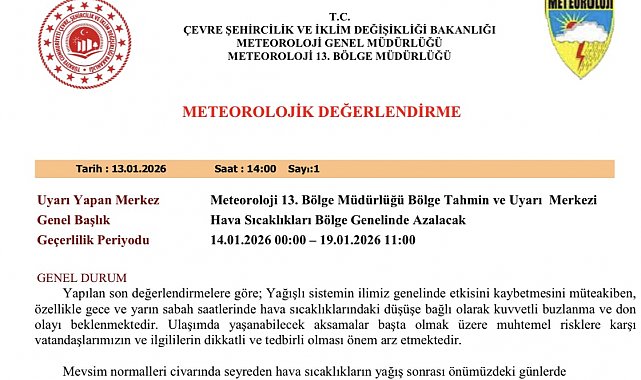 Meteoroloji 13. Bölge Müdürlüğü'nden yapılan uyarıda, "Yapılan son değerlendirmelere göre; yağışlı sistemin ilimiz genelinde etkisini kaybetmesini müteakiben, özellikle gece ve yarın sabah saatlerinde hava sıcaklıklarındaki düşüşe bağlı olarak kuvvetli buzlanma ve don olayı beklenmektedir. Ulaşımda yaşanabilecek aksamalar başta olmak üzere muhtemel risklere karşı vatandaşlarımızın ve ilgililerin dikkatli ve tedbirli olması önem arz etmektedir. Mevsim normalleri civarında seyreden hava sıcaklıkların yağış sonrası önümüzdeki günlerde mevsim normallerinin 4 ila 7 derece altında seyretmesi beklenmektedir" denildi.