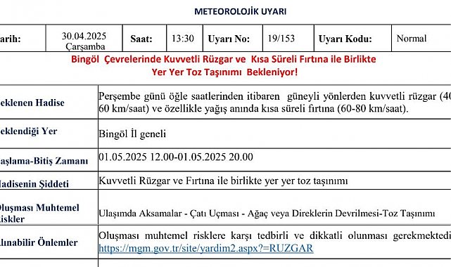 Meteoroloji 13. Bölge Müdürlüğü, Bingöl için kuvvetli rüzgar ve fırtına ile yer yer toz taşınımı uyarısı yaptı.