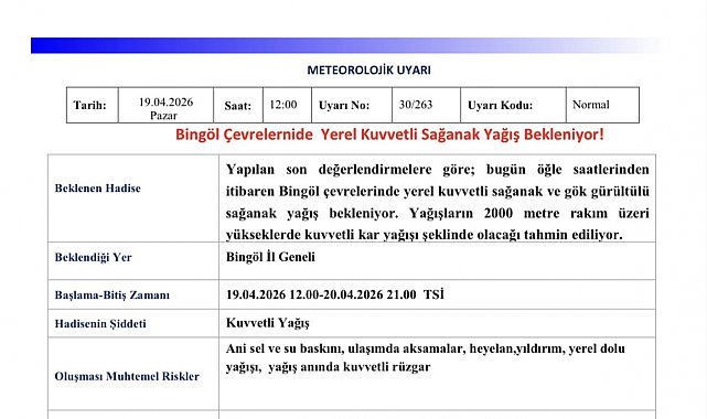 Meteoroloji 13. Bölge Müdürlüğü tarafından yapılan açıklamada, "Yapılan son değerlendirmelere göre; bugün öğle saatlerinden itibaren Bingöl çevrelerinde yerel kuvvetli sağanak ve gök gürültülü sağanak yağış bekleniyor. Yağışların 2000 metre rakım üzeri yükseklerde kuvvetli kar yağışı şeklinde olacağı tahmin ediliyor. Oluşması muhtemel risklere karşı tedbirli ve dikkatli olunması gerekmektedir" denildi.