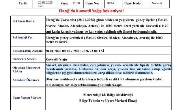 Meteoroloji 13. Bölge Müdürlüğünden yapılan açıklamada, "Elazığ'da çarşamba günü beklenen yağışların güney ilçeler ( Baskil, Sivrice, Maden, Alacakaya, Arıcak) ile 1500 metre üzeri yerlerde kuvvetli (10-20cm) karla karışık yağmur ve kar yağışı şeklinde görülmesi beklenmektedir. Ani sel, ulaşımda aksamalar, çatı çökmesi, yüksek kesimlerde tipi ile birlikte görüş mesafesinde azalma, buzlanma ve don olayı, yüksek kar örtüsüne sahip eğimli bölgelerde çığ gibi olumsuzluklara karşı dikkatli ve tedbirli olunmalıdır" ifadelerine yer verildi.