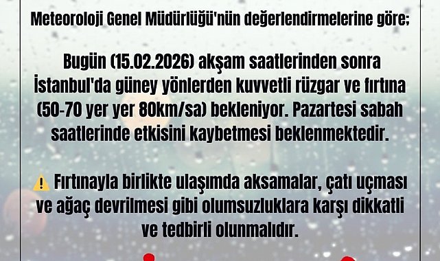 Meteoroloji Genel Müdürlüğü, İstanbul'da akşam saatlerinden itibaren güney yönlerden kuvvetli rüzgar ve fırtına beklendiğini duyurdu. İstanbul Valiliği'nin sosyal medya hesabından yapılan paylaşımda, çatı uçması gibi olaylara karşı vatandaşların dikkatli olmaları istendi.