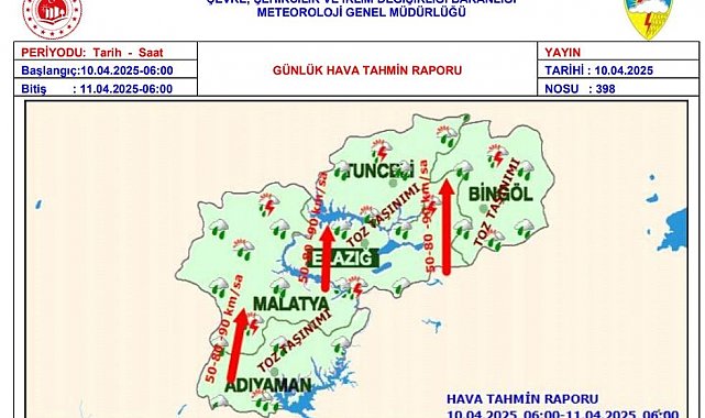 Meteoroloji 13. Bölge Müdürlüğü Elazığ, Malatya, Bingöl, Adıyaman ve Tunceli için rüzgar, toz taşınımı ve dolu uyarısında bulundu.