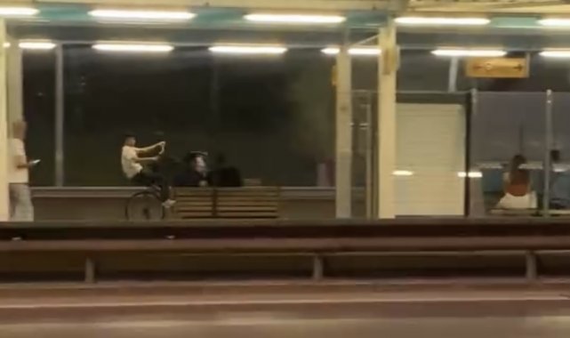 Olay, BursaRay metro hattının yoğun istasyonlarından birinde meydana geldi. Kimliği henüz belirlenemeyen genç, çevresindeki kalabalığa aldırış etmeden bisikletiyle turnikelerden geçip peron bölümüne doğru ilerledi. Bununla da yetinmeyen şahıs, bisikletin ön tekerini havaya kaldırarak tek teker üstünde sürüş yaprak tehlike saçtı. O anlar çevredeki vatandaşların kamerasına yansıdı.
