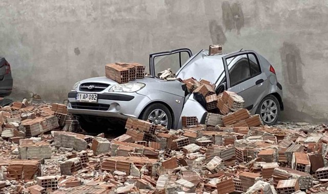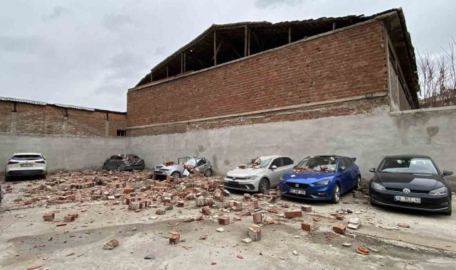 Metruk binanın çatı duvarı otoparka devrildi, 6 araçta hasar oluştu