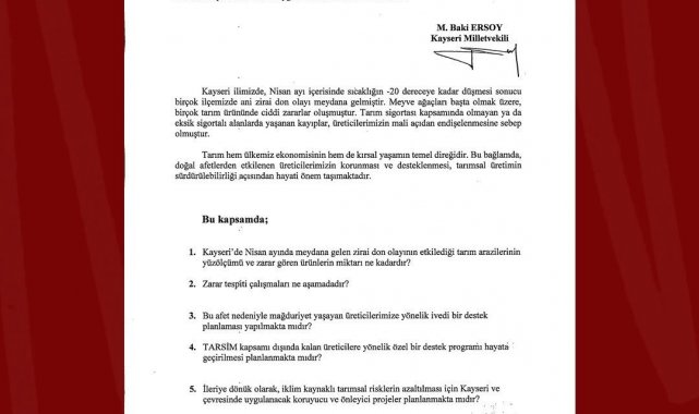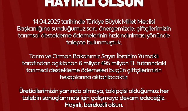 Ersoy paylaşımında şu ifadelere yer verdi; "Çiftçilerimize hayırlı olsun. 14.04.2025 tarihinde Türkiye Büyük Millet Meclisi Başkanlığına sunduğumuz soru önergemizde; çiftçilerimizin tarımsal destekleme ödemelerinin hızlandırılması yönünde talepte bulunmuştuk. Tarım ve Orman Bakanımız Sayın İbrahim Yumaklı tarafından açıklanan 6 milyar 495 milyon TL tutarındaki tarımsal destekleme ödemeleri bugün çiftçilerimizin hesaplarına aktarılacaktır. Üreticilerimizin yanında olmaya, takipçisi olduğumuz her talebin sonuçlanması için çalışmaya devam edeceğiz. Hayırlı, bereketli olsun."