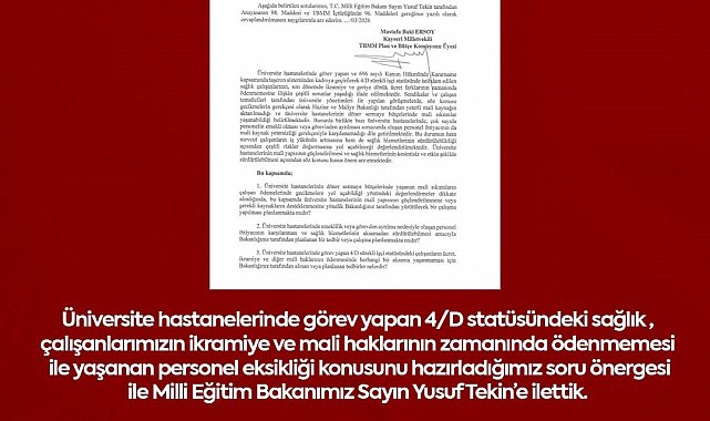 "Üniversite hastanelerinde görev yapan 4/D statüsündeki sağlık çalışanlarımızın ikramiye ve mali haklarının zamanında ödenmemesi ile yaşanan personel eksikliği konusunu hazırladığımız soru önergesi ile Milli Eğitim Bakanımız Sayın Yusuf Tekin'e ilettik. Sağlık çalışanlarımızın emeğinin karşılığını zamanında alması ve üniversite hastanelerimizin hizmetlerini aksatmadan sürdürebilmesi için konunun takipçisi olacağız."