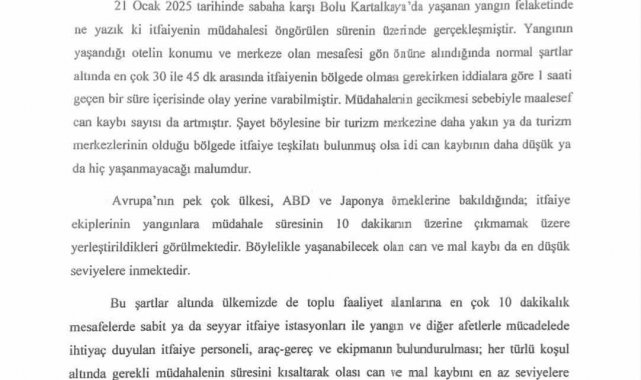 "Ülkemizde yangın ve diğer afetlere müdahale süresinin insanımızı hayatta tutabilmek için ne derecede kritik öneme sahip olduğunu Bolu'da çok acı bir şekilde tecrübe ettik. Bu kapsamda her ilimizde itfaiye ekiplerinin yangın ve diğer afetlere en fazla 10 dakikada müdahale etmelerini zorunlu hale getirecek kanun teklifimizi Meclisimize sunduk. Ayrıca 'Binaların Yangından Korunması Hakkındaki Yönetmelik' uyarınca turizm tesislerinin periyodik olarak denetlenmesini öngören kanun teklifimizi de hazırlıyoruz. Sayın Genel Başkanımız Devlet Bahçeli'nin TBMM grup toplantımızda ifade buyurdukları gibi MHP olarak hem bir daha böylesi felaketlerin yaşanmaması hem de kim olursa olsun sorumluların gereken cezayı alması için atılması gereken adımların kararlılıkla ve sonuna kadar takipçisi olacağız."