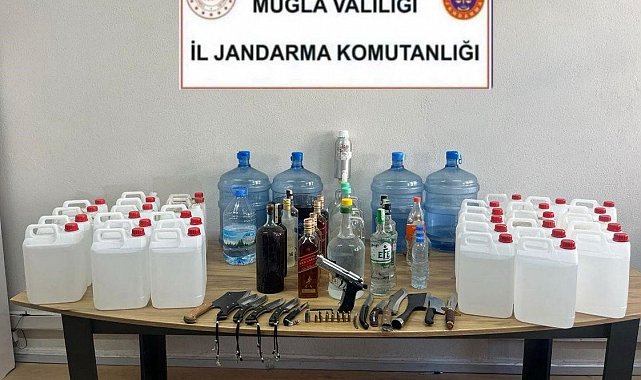 Muğla'nın Milas ilçesinde jandarma ekiplerinin düzenlediği eş zamanlı operasyonda, çok miktarda sahte içki, ruhsatsız silah ve kesici alet ele geçirildi. Olayla ilgili iki şüpheli gözaltına alındı