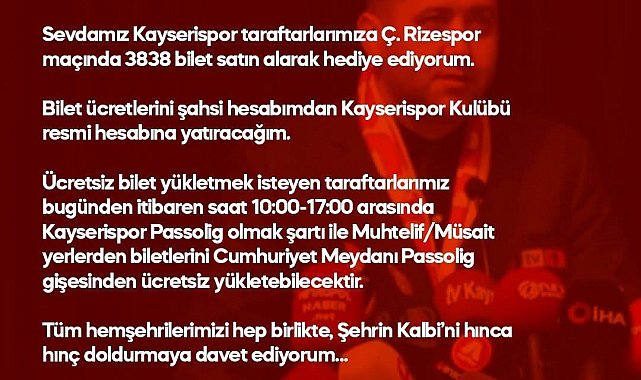 MHP Kayseri Milletvekili Baki Ersoy; Cumartesi günü oynanacak Kayserispor - Çaykur Rizespor maçı için sarı kırmızı taraftarlara bilet desteği sundu. 3838 bilet hediye edeceğini açıklayan MHP Kayseri milletvekili Baki Ersoy, "Sevdamız Kayserispor taraftarlarımıza Ç. Rizespor maçında 3838 bilet satın alarak hediye ediyorum. Bilet ücretlerini şahsi hesabımdan Kayserispor Kulübü resmi hesabına yatıracağım. Ücretsiz bilet yükletmek isteyen taraftarlarımız Kayserispor Passolig olmak şartı ile muhtelif/müsait yerlerden biletlerini Cumhuriyet Meydanı Passolig gişesinden ücretsiz yükletebilecektir. Tüm hemşehrilerimizi hep birlikte, Şehrin Kalbi'ni hınca hınç doldurmaya davet ediyorum" dedi.