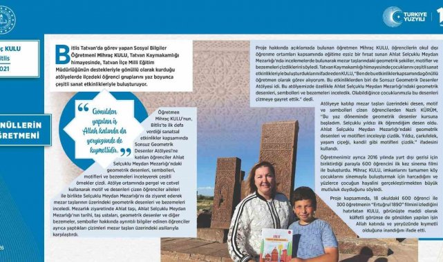 Sosyal Bilgiler Öğretmeni Mihraç Kulu'nun Bitlis'te 2014-2022 yılları arasında yaptığı projeler de MEB'in Cumhuriyet'in 100. yılına özel "Maarifin Yüz Akı" e-dergisinde ilk 20'ye giren öğretmenlerin ilham verici uygulama örnekleri arasında yer aldı. Milli Eğitim Bakanlığından (MEB), yapılan açıklamaya göre, MEB Strateji Geliştirme Başkanlığınca yayımlanan "Maarifin Yüz Akı" e-dergisinde, yenilikçi çözümler üreten, hayal gücü sınır tanımayan öğrenci ve öğretmenlere ait başarı hikayeleri, fark oluşturan proje çalışmaları ve ilham verici uygulama örnekleri yer aldı. Bakanlığın merkez ve taşra teşkilatı birimleri ile birlikte hareket edilerek toplam 10 binin üzerinde iyi uygulama incelendi. Türkiye'nin tüm illerinden, farklı branş ve kademelerden öğretmen kategorisinde 20, öğrenci kategorisinde 54 ve eğitim kurumları kategorisinde 26 çalışma olmak üzere toplam 100 iyi uygulama örneğine yer verildi. 2014 ile 2022 yılları arasında Bitlis'in Tatvan ilçesinde görev yapan Sosyal Bilgiler Öğretmeni Mihraç Kulu'nun, 2021 yılında Ahlat Selçuklu Meydan Mezarlığı'ndaki tarihi mezar taşları üzerinde bulunan motiflerden yola çıkarak uyguladığı 'Sonsuz Geometrik Desenler Atölyesi projesi ve 2016 yılında köy çocuklarını sinemayla buluşturduğu 'Tarihe Yolculuk' projeleri ilham verici uygulama örnekleri arasında ilk 20'ye girdi.