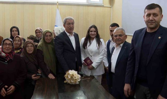 Milli Savunma Bakanı Hulusi Akar, ziyaret ettiği Tomarza Belediyesinde bir nikahın kıyıldığını görmesi üzerine salona girerek yeni çifte sürpriz yaptı. Nikahları kıyılan Sefa-Rabia Baş Bakan Akar'ı karşılarında görünce büyük heyecan yaşadı.