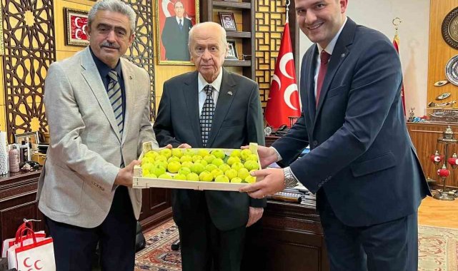 Milliyetçi Hareket Partisi (MHP) Genel Başkanı Devlet Bahçeli'yi makamında ziyaret eden MHP Aydın İl Başkanı Haluk Alıcık ile MHP Merkez Yönetim Kurulu (MYK) Üyesi Burak Pehlivan, Bahçeli'ye Aydın İnciri'ni ikram etti.