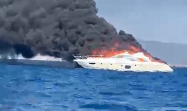 Muğla'nın Bodrum ilçesi Türkbükü açıklarında demirli lüks yat, çıkan yangında alev alev yandı.
