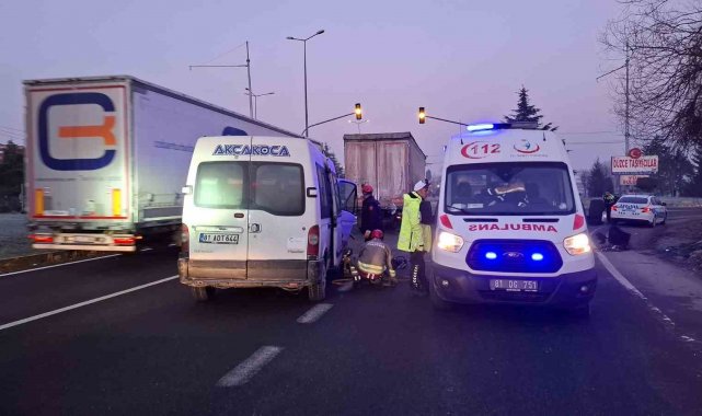 Kaza sabah saatlerinde Düzce Merkez hal kavşağı mevkiinde meydana geldi. Alınan bilgilere göre Düzce'den Sakarya istikametine gitmekte olan T. K. idaresindeki 81 ADT 644 plakalı minibüs H. B. idaresindeki 81 ADP 820 plakalı tıra arkadan çarptı. Kazada minibüs sürücüsü direksiyonda sıkıştı. Kazayı görenlerin 112 Acil Çağrı Merkezine yaptığı ihbar üzerine bölgeye sağlık, polis ve itfaiye ekipleri sevk edildi. Kısa sürede olay yerine gelen ekipler sıkışan sürücüsü bulunduğu yerden kurtarıldı. Sağlık ekipleri tarafından kontrolleri yapılan sürücüsü daha sonra Düzce Atatürk Devlet hastanesine kaldırılarak tedavi altına alındı. Kaza nedeniyle kısmen kapanan yol araçların kaldırılmasının ardından tekrar trafiğe açıldı. Kazanın oluşu ile ilgili ise inceleme başlatıldı.