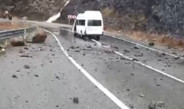 Minibüsün üzerine dev kayalar düştü, 3 kişi şans eseri kurtuldu