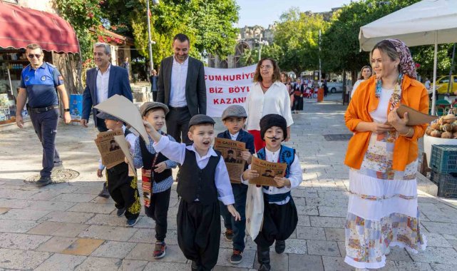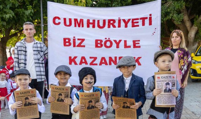 Manavgat Belediyesi Side Kreş ve Gündüz Bakımevi öğrencileri, 29 Ekim Cumhuriyet Bayramı etkinliği kapsamında hazırladıkları "Cumhuriyet ilan edildi" manşetli sembolik gazeteleriyle Antik Side sokaklarında vatandaşlara Cumhuriyet coşkusunu yaşattı.