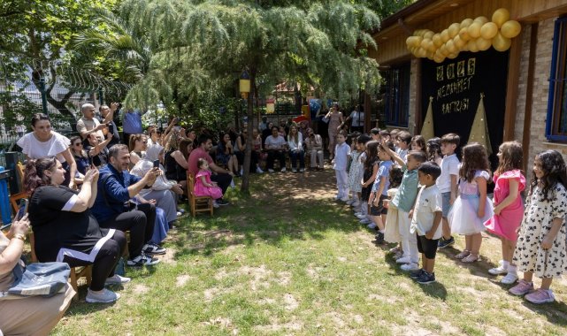 Mezuniyet töreninin sonunda minik öğrenciler ilk diplomalarını alarak kep atarak aileleriyle birlikte fotoğraf çektirdi.