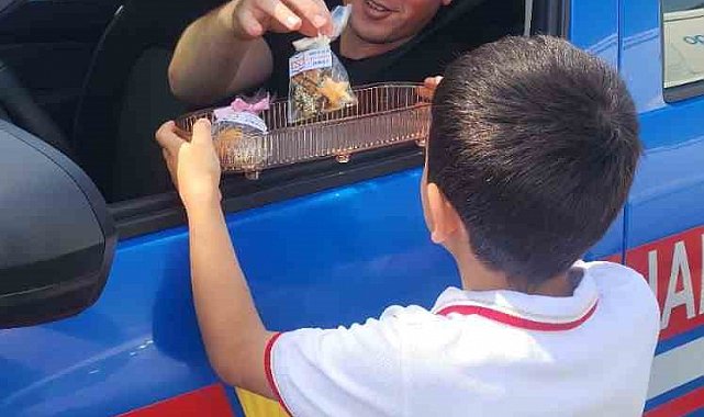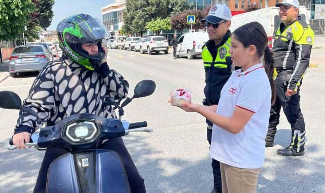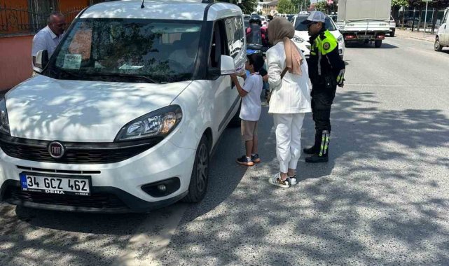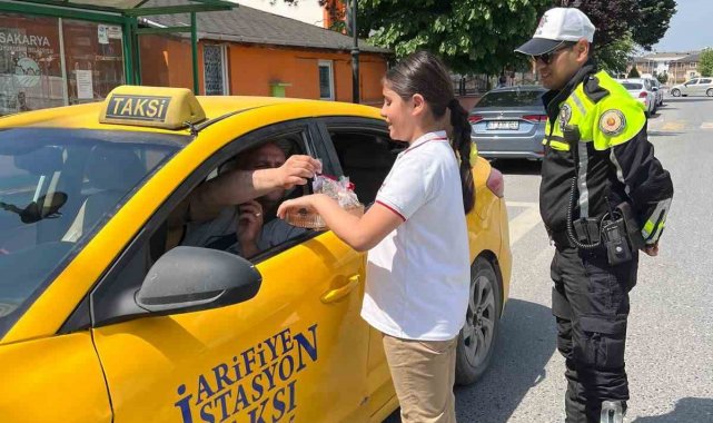 Sakarya'nın Arifiye ilçesinde ilkokul öğrencileri, yaya geçidinde sürücülere kurabiye ikram ederek trafik bilincini tatlı bir dille hatırlattı.