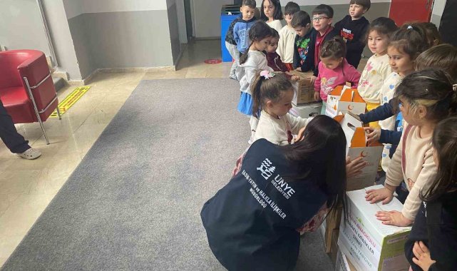 Ordu'nun Ünye ilçesinde anaokulu öğrencileri, hazırladıkları Ramazan kolilerini ihtiyaç sahibi ailelere ulaştırılmak üzere Ünye Belediyesi ekiplerine teslim etti.