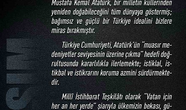Milli İstihbarat Teşkilatı (MİT) Başkanı İbrahim Kalın, 10 Kasım Atatürk'ü Anma Günü dolayısıyla bir mesaj yayımladı. Kalın mesajında, "Aziz milletimizin asil ruhunu ve birlik azmini temsil eden Millî Mücadelenin Başkomutanı Gazi Mustafa Kemal Atatürk, bir milletin küllerinden yeniden doğabileceğini tüm dünyaya göstermiş; bağımsız ve güçlü bir Türkiye idealini bizlere miras bırakmıştır" dedi.