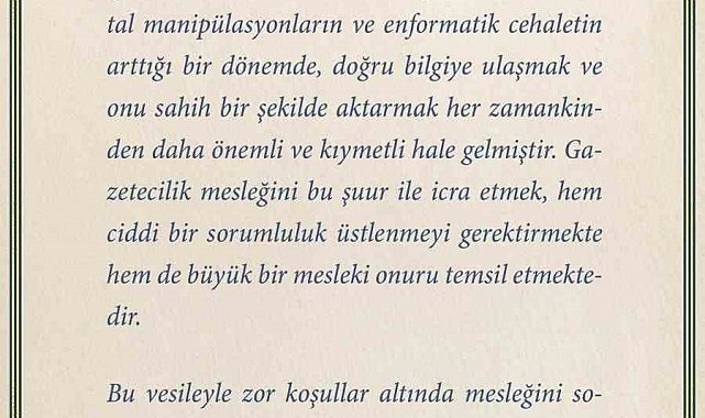 "Çok boyutlu krizlerin, sanal saptırmaların, dijital manipülasyonların ve bilişim cehaletinin arttığı bir dönemde, doğru bilgiye ulaşmak ve onu sahih bir şekilde aktarmak her zamankinden daha önemli ve kıymetli hale gelmiştir. Gazetecilik mesleğini bu şuur ile icra etmek, hem ciddi bir sorumluluk üstlenmeyi gerektirmekte hem de büyük bir mesleki onuru temsil etmektedir. Bu vesileyle zor şartlar altında mesleğini sorumluluk bilinciyle icra eden, hakikatin izini sürerken pusulası doğru bilgi, muhakeme ve vicdan olan tüm kıymetli basın mensuplarını kutluyor, görevi başında hayatını kaybeden basın mensuplarını rahmetle anıyorum."