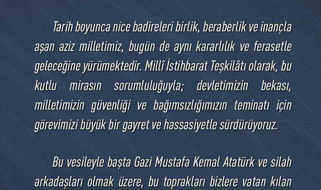 Tarih boyunca nice badireleri birlik, beraberlik ve inançla aşan milletin bugün de aynı kararlılık ve ferasetle geleceğe yürüdüğünü aktaran Kalın, "MİT olarak, bu kutlu mirasın sorumluluğuyla; devletimizin bekası, milletimizin güvenliği ve bağımsızlığımızın teminatı için görevimizi büyük bir gayret ve hassasiyetle sürdürüyoruz. Bu vesileyle başta Gazi Mustafa Kemal Atatürk ve silah arkadaşları olmak üzere, bu toprakları bizlere vatan kılan tüm şehitlerimizi rahmet, minnet ve saygıyla anıyor; aziz milletimizin 30 Ağustos Zafer Bayramı'nı en içten duygularımla kutluyorum" ifadelerini kullandı.